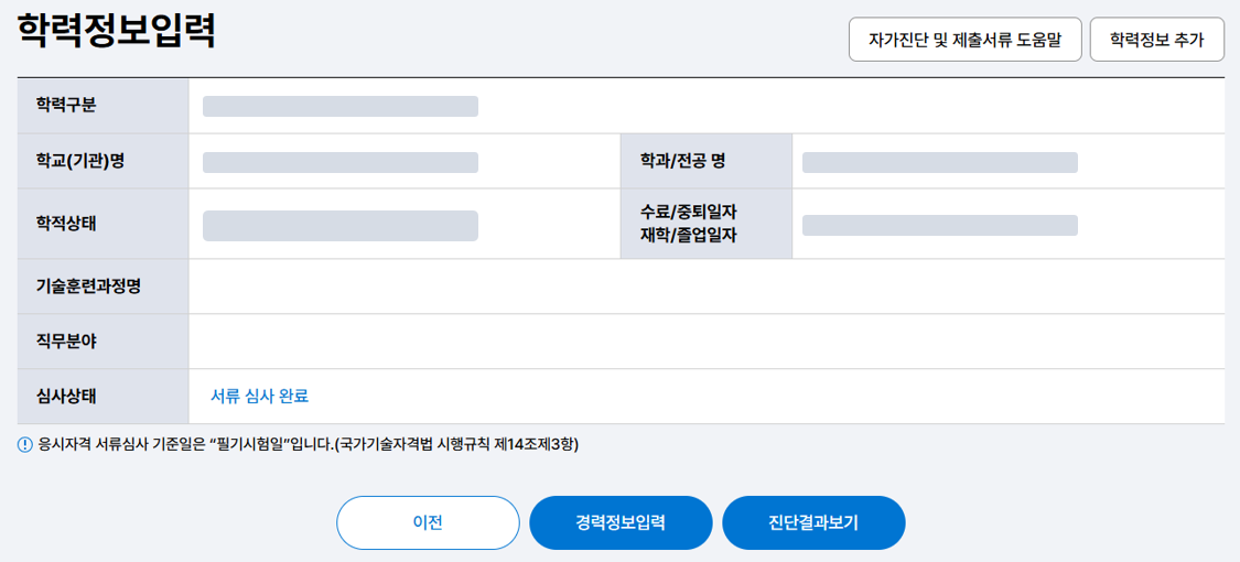 응시하는 자격증이 있으면 반드시 응시자격을 확인해야합니다. 응시자격 자가진단을 통해서 응시할 수 있는지 확인해야하고 추후 서류 제출을 해야합니다.