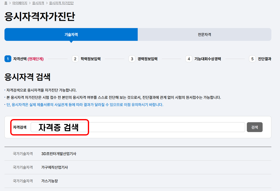 1) 먼저 응시자격자가진단에서 자격증을 검색합니다.