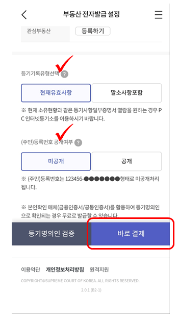 5) 필요사항 선택(등기기록과 주민번호 공개여부) 후 결제하면 끝!!