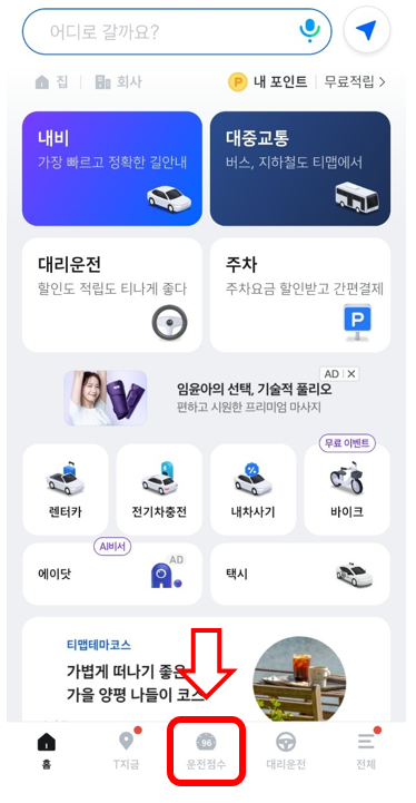 T map 실행 후 운전점수 클릭 ▶ 내 자동차보험 혜택 ▶ 보험사별 대상 및 신청방법, 유의사항 확인하기