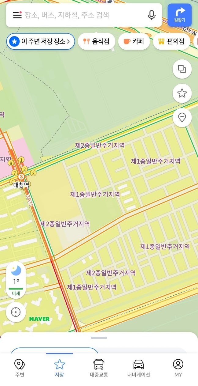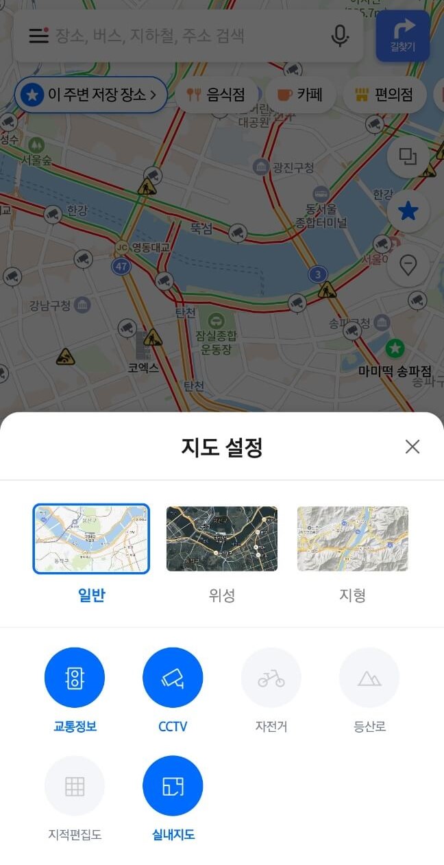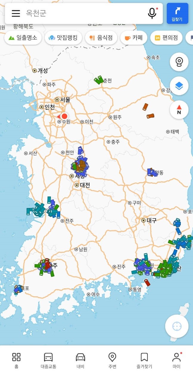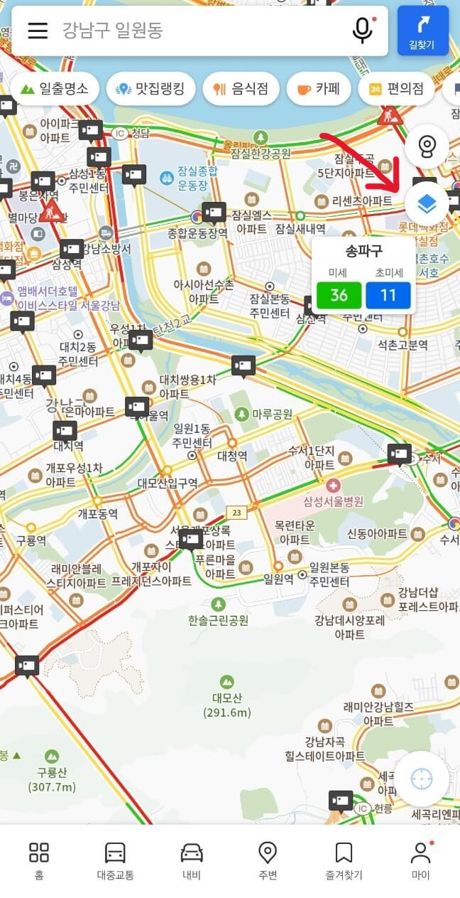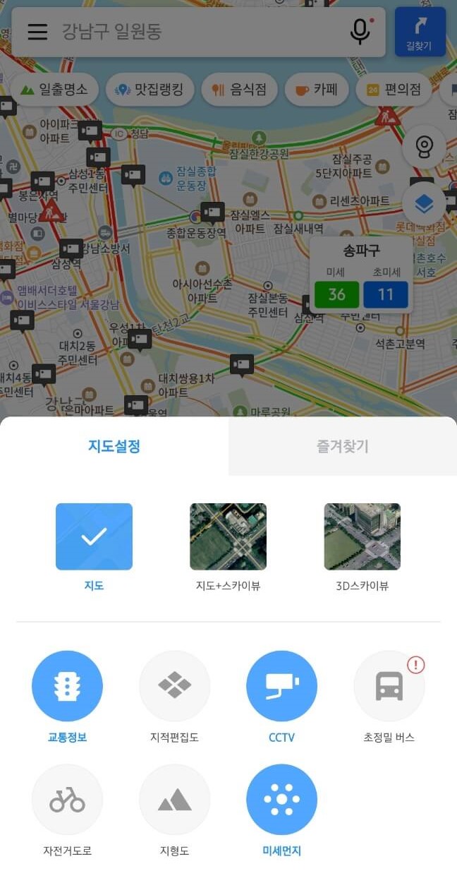 네이버지도와 비슷한데요. 추가적인 기능이 있다면 미세먼지 현황과 초정밀 버스 정보가 있습니다. 지역별로 현재 미세먼지 농도를 확인할 수 있고, 초정밀 버스는 지역별 버스 운행을 실시간 확인할 수 있습니다. 그치만 지원되는 지역이 아직 많지 않은 것 같네요 ㅎㅎ. 카카오맵도 지적편집도가 있습니다.