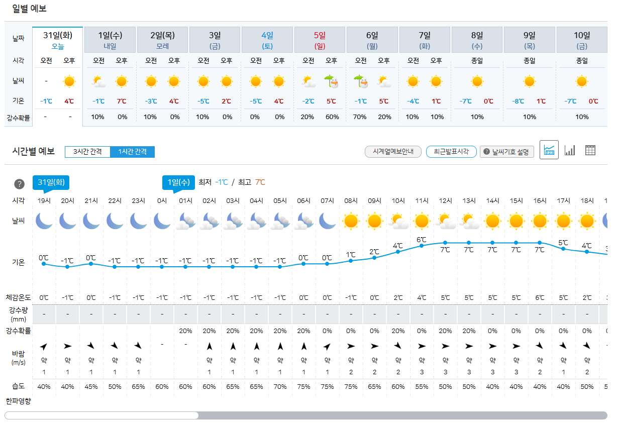 일반적으로 가장 많이 찾아보는 곳은 기상청 홈페이지입니다. 메인 화면에서는 간단한 기본 정보를 알 수 있습니다. 기본적으로 현재 기온, 미세먼지 농도, 일출과 일몰 시간 정보를 확인할 수 있고, 밑에서는 일별로 현재 날씨 정보와 예측 날씨 정보를 알 수 있습니다.