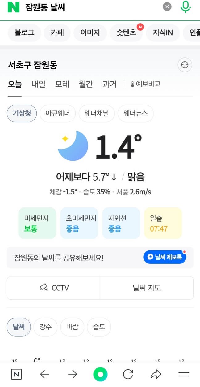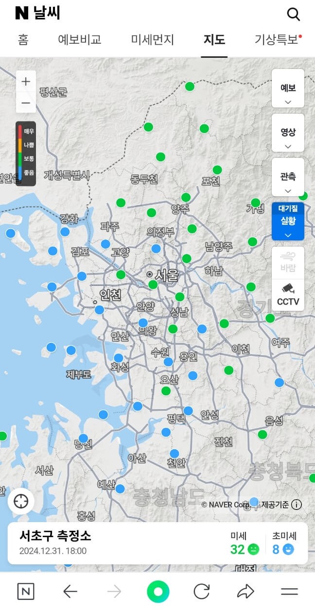 마지막으로 네이버 포털사이트를 이용하는 방법입니다. 가장 많이 알려져있고, 네이버 어플은 대부분 사용하시기 때문에 간편하게 이용해볼 수 있습니다. 네이버 포털이나 어플을 열고 검색창에 [지역명 + 날씨] 라고 입력해주시면 기본적인 날씨 정보는 알 수 있습니다. 그렇지만 가장 큰 장점은 지역별 대기질 정보와 실시간 교통 CCTV 정보를 확일할 수 있다는 건데요. 전체 지역의 미세먼지 농도를 확인할 수 있고, 주요 도로별 실시간 교통 정보도 할 수 있으니 활용해보시기 바랍니다.