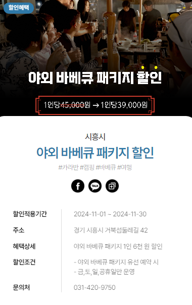 2. 야외 바베큐 패키지 할인(숙박x) 1인당 45,000원 → 1인당 39,000원