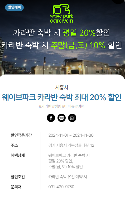 가을이 되면서 힐링 여행 많이들 계획하시죠? 오늘은 특별히 시흥에 위치한 웨이브파크 카라반을 추천해드리겠습니다. 이곳은 자연과 함께하는 특별한 경험을 제공하며, 가을의 아름다움을 만끽할 수 있는 최적의 장소입니다. 시흥 웨이브파크에 대한 소개와 아래 할인 혜택도 알려드릴게요. 놓치지말고 꼭 즐거운 추억 만들어 보세요~^^