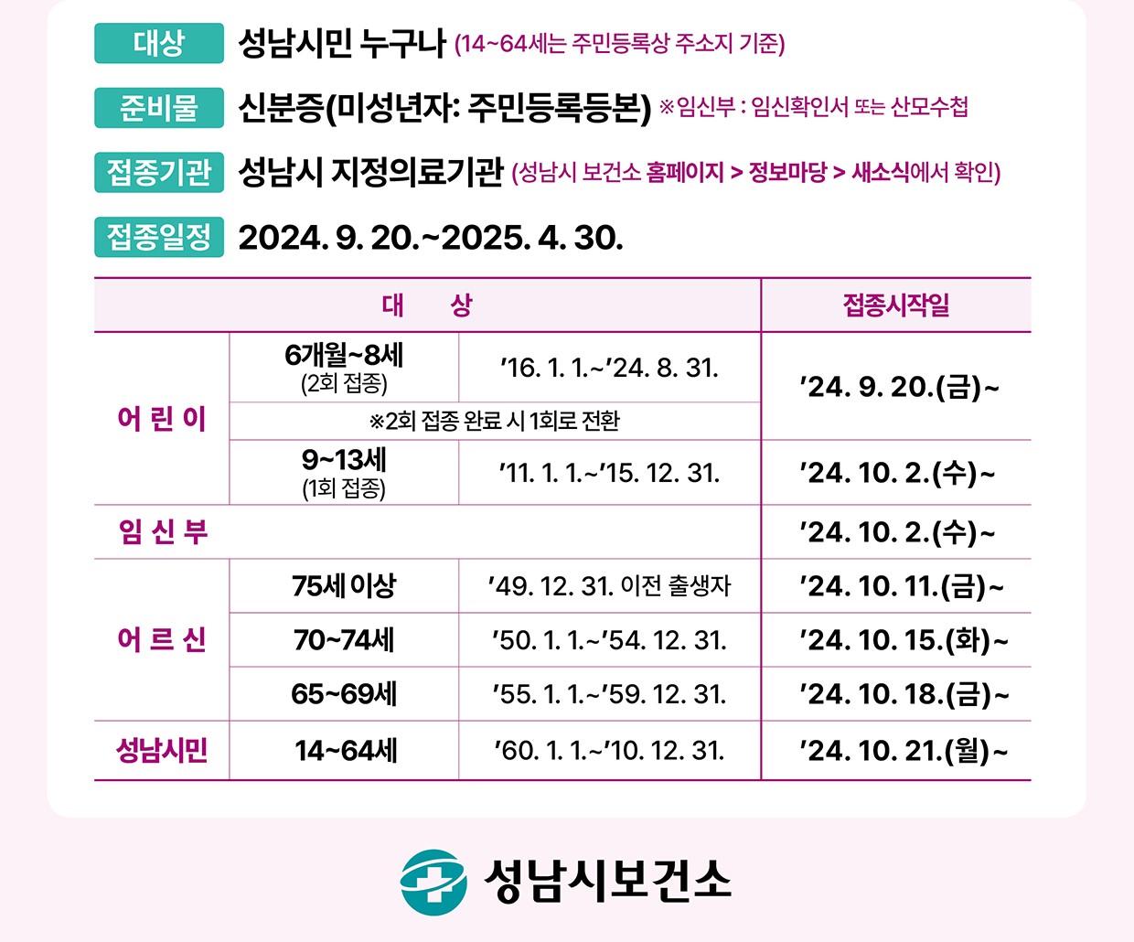 24년 9월부터 시행된 성남시 무료 독감 예방접종 소식입니다.