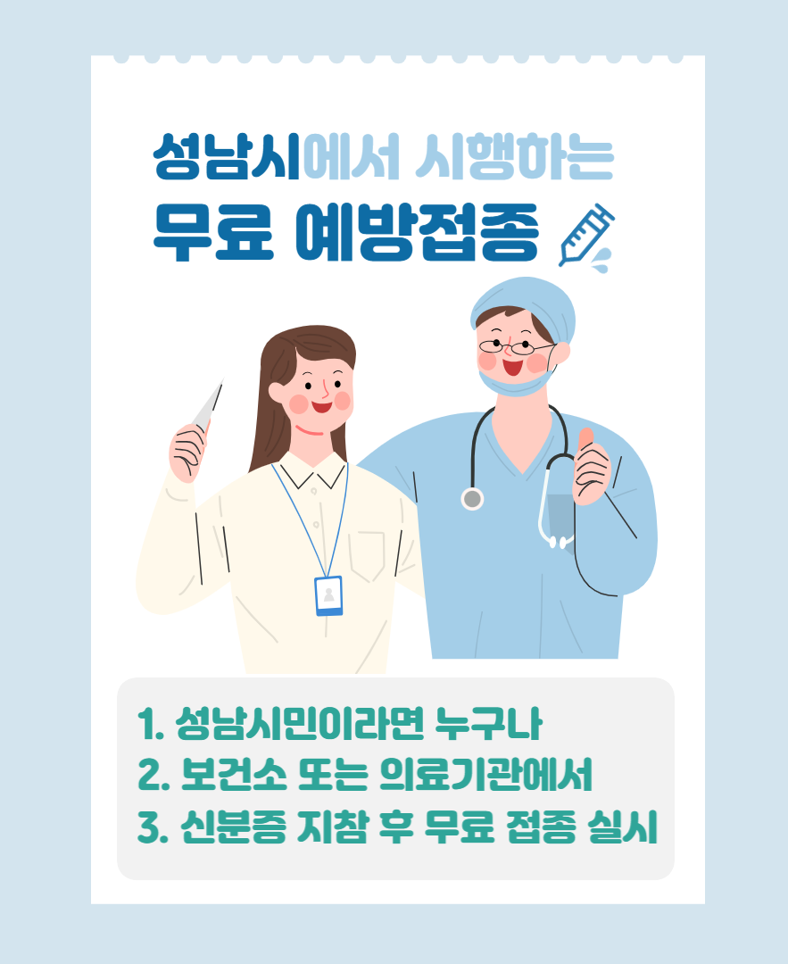 성남시에서는 성남 시민이라면 누구나 무료 독감 예방접종을 맞을 수 있습니다.